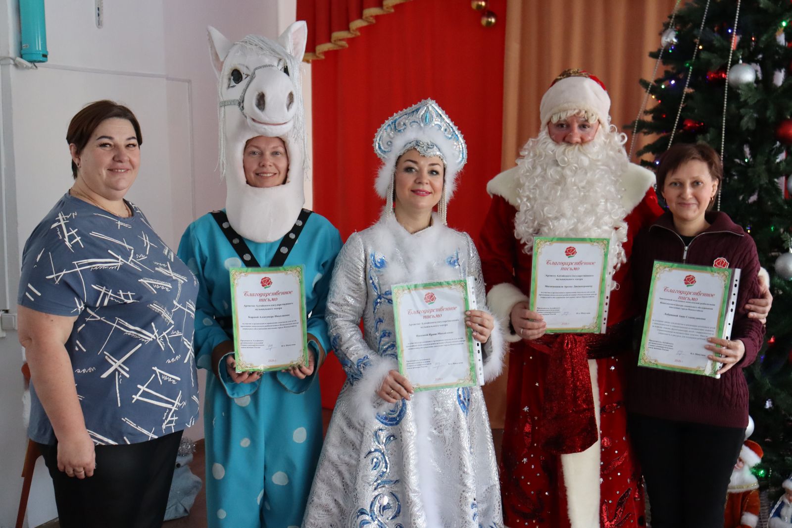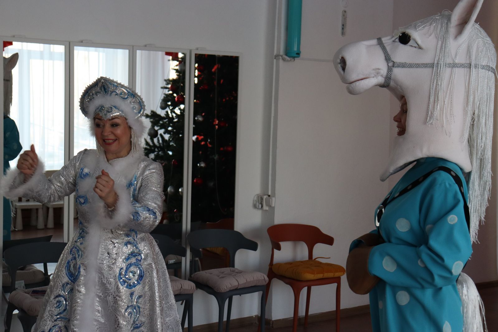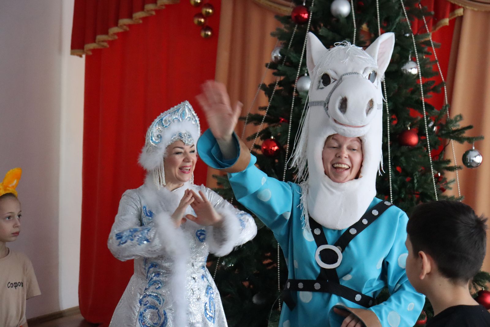 Для полного погружения в волшебство, артисты театра создали яркие сказочные образы. Ирина Ишкова очаровала всех присутствующих, выйдя на сцену в роли обаятельной Снегурочки. Александра Карпова проявила чудеса перевоплощения, став и веселым конём (символом года), и добрым Снеговиком. Главным волшебником праздника стал Дед Мороз в исполнении Арсена Митичашвили.