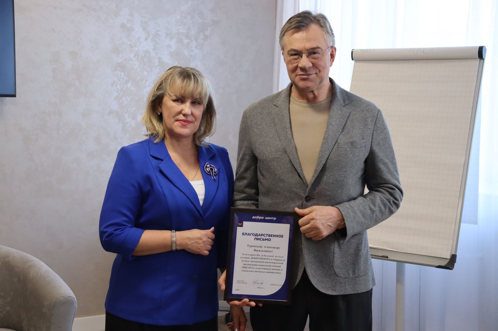 Ольга Чехонадских в свою очередь вручила благодарственное письмо Александру Терентьеву в благодарность за всестороннюю поддержку.