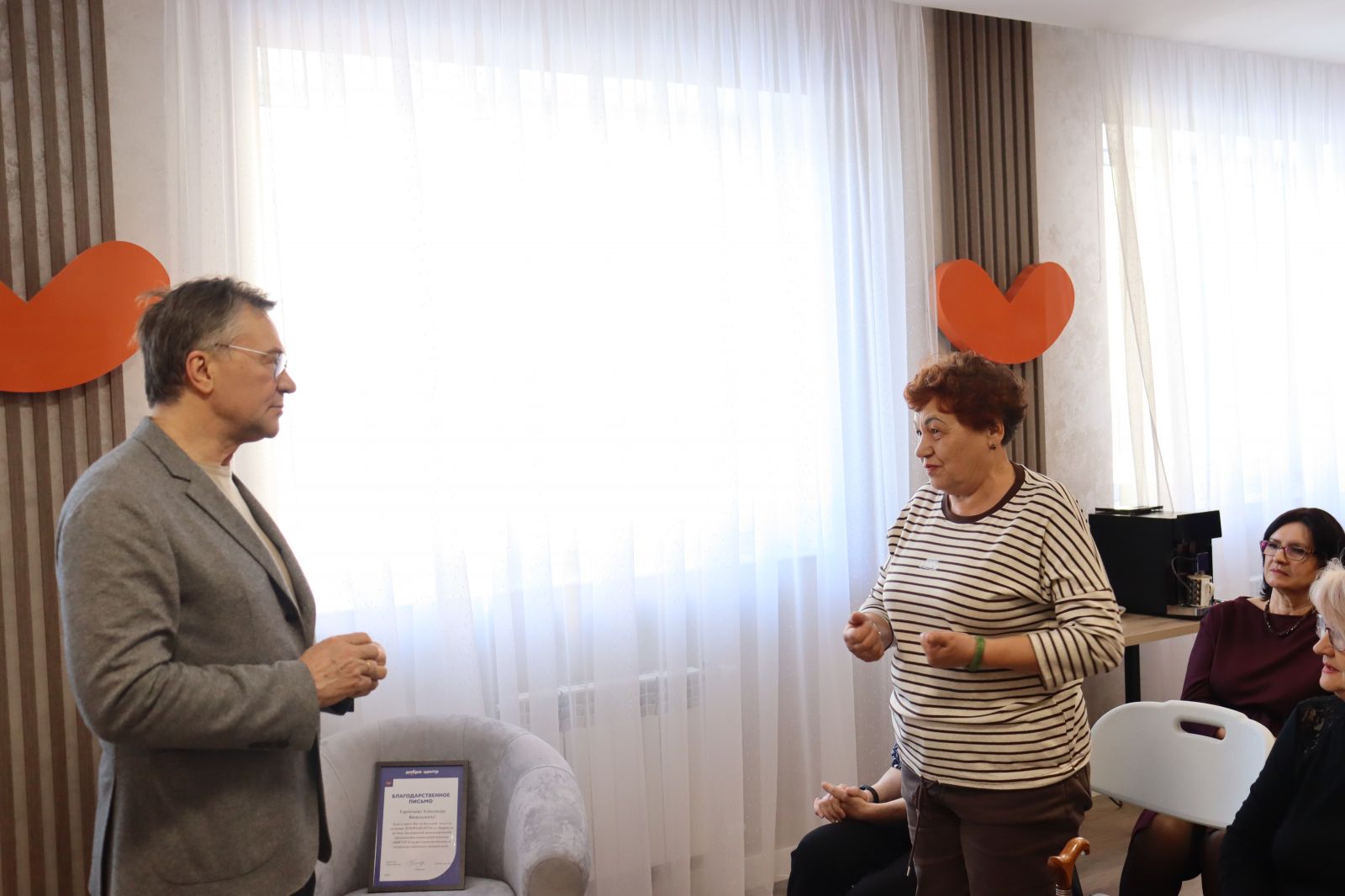 Александр Терентьев вручил благодарственное письмо Оксане Грицай, подчеркнув значимость её работы, добрых дел, которая она делает. "Видеть, с какой любовью здесь сделано каждое дело, от выбора цвета стен до создания ролика, мотивирует. Это не просто офис, это дом, где рождается добро", – подчеркнул Александр Терентьев. Также депутат вручил партийный билет активисту центра Константину Ершову, пожелав плодотворной работы на благо жителей Алтайского края.
