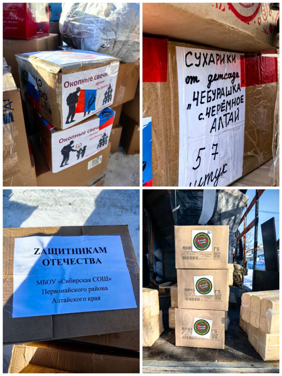 Активное участие в сборе груза приняли жители п. Сибирского. На собранные ими средства удалось закупить сетку рабицу, 25 упаковок топливных брикетов, газ. Прихожане местного храма "Покрова Пресвятой Богородицы" передали освящённые иконы. Рукодельницы нескольких населённых пунктов Первомайского района связали около 150 пар носков. Также теплые носки передали сотрудники Сибирского Дома культуры.