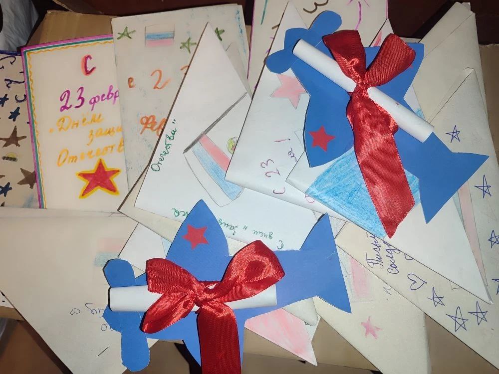 Отдельное место в собранном гуманитарном грузе заняли проникновенные письма и открытки ко Дню защитника Отечества. Их изготовили учащиеся 2-го, 3-го, 5-го, 8-го классов вместе с педагогами-наставниками, а также воспитанники краевого реабилитационного центра "Радуга". Активистка "Социал-демократического союза женщин России" в Алтайском крае Татьяна Копейкина передала 100 писем от студентов Барнаульского кооперативного техникума.